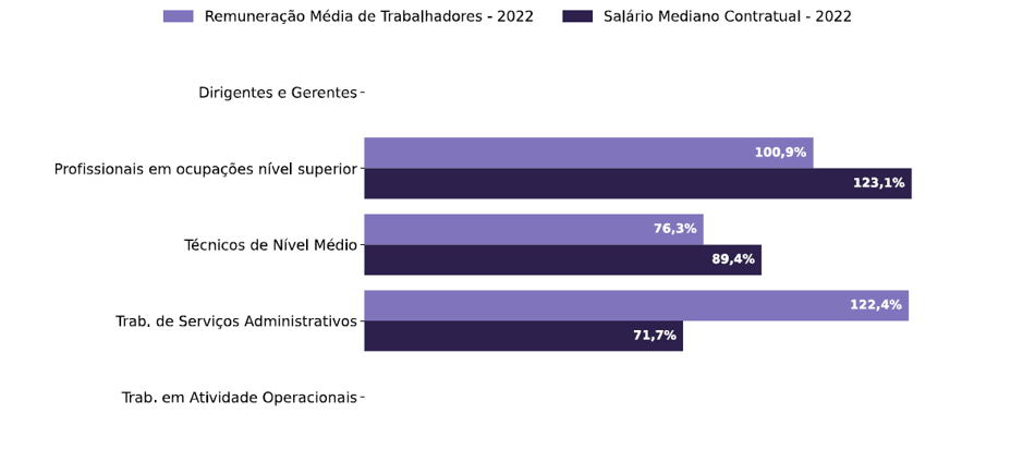 OBS: Para cada grupo de ocupação que não apresenta cálculo da diferença, para salário de contratação ou para remuneração média, pode ter ocorrido um dos seis motivos: (1) por ter menos de três mulheres; (2) por ter menos de três homens; (3) por não ter mulheres; (4) por não ter homens; (5) por não ter três homens nem três mulheres naquele grupo ocupacional; (6) por não ter nem homens nem mulheres  naquele grupo ocupacional